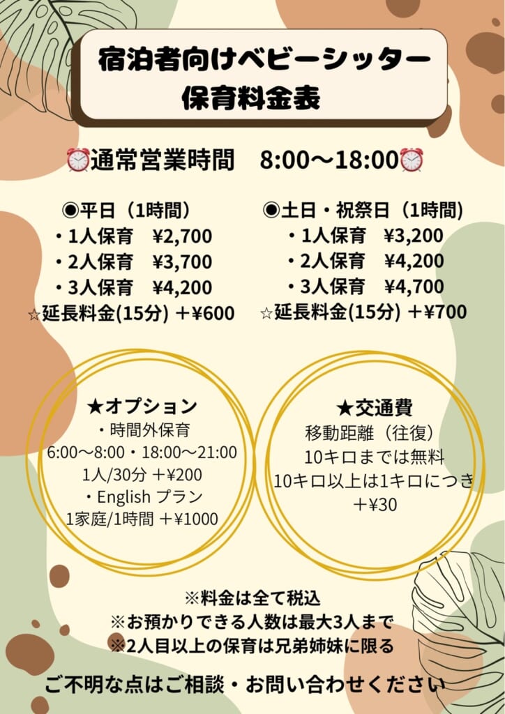 | 1人保育 | ¥2,700 | ¥3,200 |